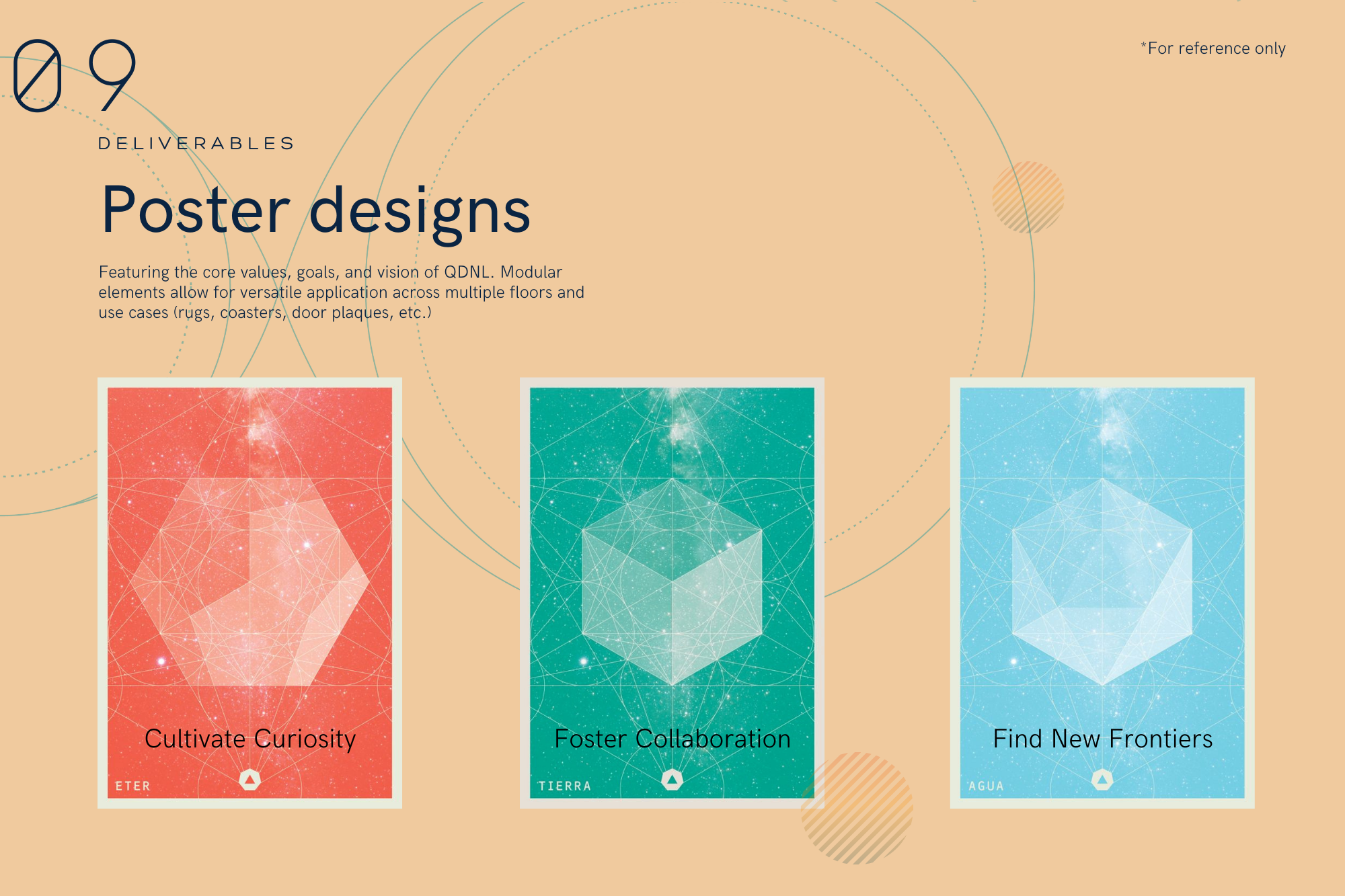 Identifying the core principles the space will invoke, I created large format posters that boast inspiring messages, as little daily reminders for the folks at QDNL to feel immense pride in the work they’re doing. I created three themes: light, dark, and bright, as extensions of each floor’s theme, using similar kaleidoscope and vapor wave design elements.